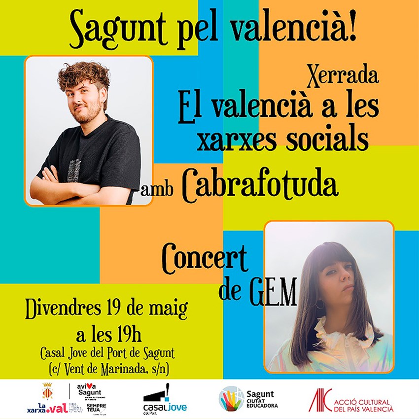 El pròxim divendres 19 de maig, dins de les activitats del Gabinet de Promoció del Valencià i en coordinació amb els actes del cicle «Lluna Nova» del departament de Joventut, tindrà lloc al Casal Jove del Port de Sagunt l’actuació de l’influencer Cabrafotuda i de la cantant Gem.