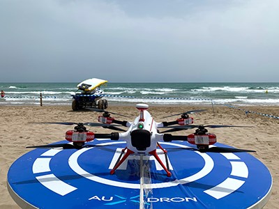Enguany el servici va començar dimecres passat, 15 de juny, i s'estendrà fins al 15 de setembre, tram que es correspon amb el període de bany en què ocorre la major part dels ofegaments en la costa mediterrània. El Auxdron LFG és un dron amb intel·ligència artificial capaç de controlar els aforaments de la platja, donar avisos als banyistes o fer rutes de vigilància i prevenció, però la seua funció principal és acurtar els temps de resposta davant una emergència, arribant ràpidament a la víctima i entregant-li un jupetí salvavides en un temps rècord, assegurant així la seua flotabilitat.