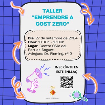 L'Ajuntament de Sagunt, a través de la regidoria de Universitat, Ciència i Innovació, impartirà este pròxim divendres 27 de setembre el taller ‘Emprendre a cost zero’ a partir de les 10 hores al Centre Cívic Antic Sanatori del Port de Sagunt.
