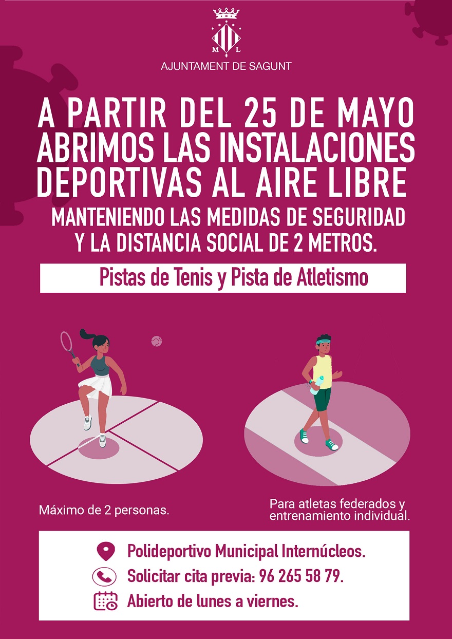 L'alcalde de Sagunt, Darío Moreno, ha concretat que l'ús de les instal·lacions esportives, situades en el Pavelló Poliesportiu Internuclis, serà de dilluns a divendres, amb cita prèvia: «Si volen sol·licitar esta cita, les persones hauran de trucar al telèfon 962 65 58 79. A més, la regidoria ha establit un protocol de seguretat i higiene que inclou tant als usuaris i usuàries, com al personal que gestiona estes instal·lacions. En el cas de les pistes d'atletisme, els entrenaments han de ser individuals i només per a persones federades i, en el cas del tenis, es parla d'un màxim de 2 persones. No es podran jugar dobles».