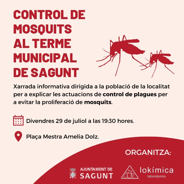 El departament de Sanitat de l'Ajuntament de Sagunt i l'empresa Lokímica, encarregada dels controls de plagues a la ciutat, oferixen esta vesprada una xarrada-taller sobre el control de mosquits en el terme municipal de Sagunt. La plaça Mestra Amelia Dolz d’Almardà acollirà esta trobada a les 19.30 hores.