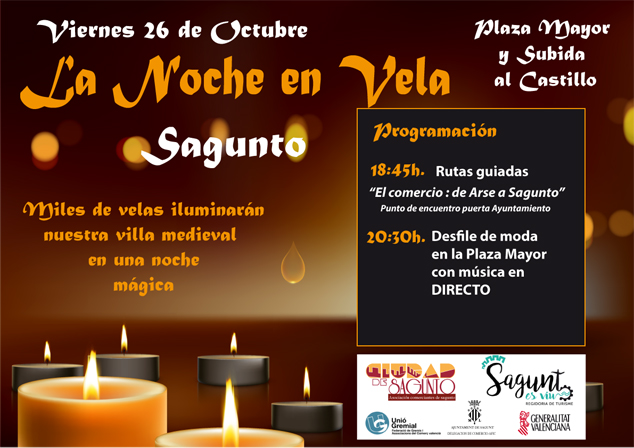 En esta jornada, dedicada al turisme, a la moda i a l'oci s'oferirà a la ciutadania com a novetat en esta edició, unes rutes guiades que eixiran des de la porta de l'Ajuntament de Sagunt a les 18:45 hores, on tots els participants de forma gratuïta participaran i gaudiran d'una guia que els introduirà en ‘El comerç: D’Arse a Sagunt’ a continuació donarà començament la tan esperada desfilada de moda a les 20.30 hores i que comptarà amb la participació dels comerços de la nostra ciutat. Com a novetat, dita desfilada comptarà amb l'actuació d'un grup de música en directe i a continuació en la pujada al Castell tots els participants d'este gran esdeveniment podran gaudir de la nostra ciutat il·luminada per els ja tradicionals ciris i de l'oferta gastronòmica que els nostres restaurants ens ofereixen.