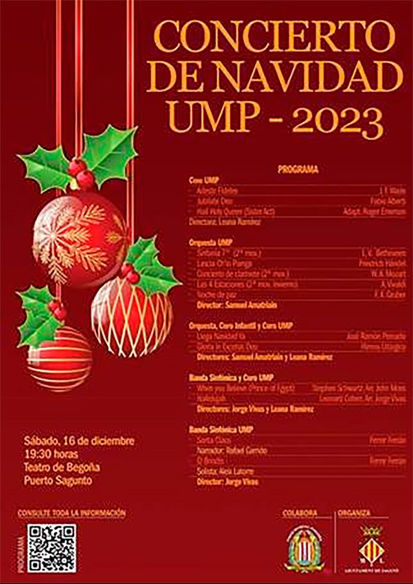 La Unión Musical Porteña oferirà el seu concert de Nadal 2023 el dissabte 16 de desembre, a les 19:30 hores, en el Teatre de Begoña (c/ Progrés, 38, el Port de Sagunt). L'entrada és gratuïta i lliure fins a completar l'aforament.