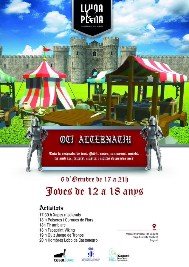 Amb l’inici del curs escolar comença també la programació d’oci alternatiu que du a terme la Regidoria de Joventut a traves del programa Lluna Plena. Este dissabte es donarà el tret d’eixida al nucli de Sagunt amb un esdeveniment de caràcter medieval al pati del Mercat Municipal, aprofitant la inauguració del Mercat Medieval que organitza la regidoria de Cultura al nucli històric . Jocs, tallers de corones, manualitats, tir amb arc, música, roses, còctels saludables, videojocs, concursos i moltes més coses tindran lloc en este espai de 17 h a 21 h de la vesprada.