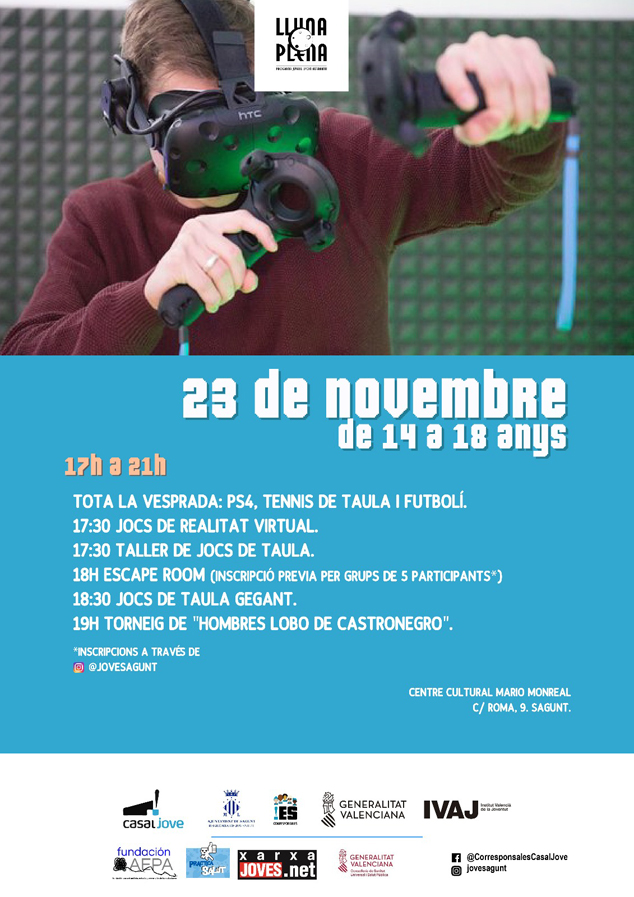 A més, com a novetat, el departament de Joventut inclou una activitat nova, Realitat Virtual on els joves podran gaudir de jocs com el ‘Fruit Ninja VR’ i experiències com en el fons del mar o en una ciutat futurista o una muntanya russa. Així mateix, hi haurà una PS4, ping pong i les tradicionals partides de rol ‘Los hombres Lobo de Castronegro’.