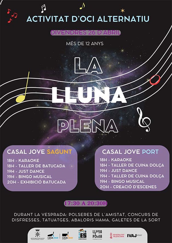 La Regidoria de Joventut i Infància de l'Ajuntament de Sagunt ha anunciat la pròxima Lluna Plena, que tindrà lloc este divendres tant en el Casal Jove de Sagunt com en el Casal Jove Port, duplicant l’oferta en tots dos centres, i es tracta d'una vesprada dedicada a oferir una experiència d'oci alternatiu en el municipi de Sagunt.