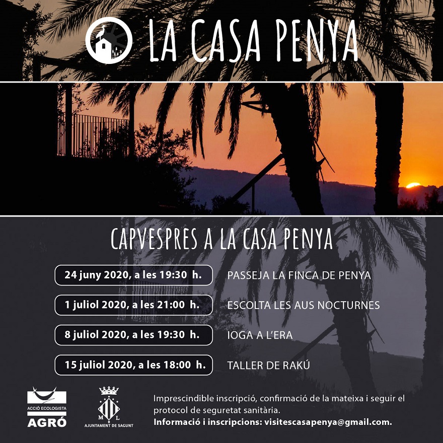 Per a participar en els Capvespres a la Casa Penya cal enviar un correu a visitescasapenya@gmail.com i rebre la confirmació de la reserva de la plaça. L'aforament de les activitats estarà limitat per a poder mantindre la distància interpersonal de seguretat.