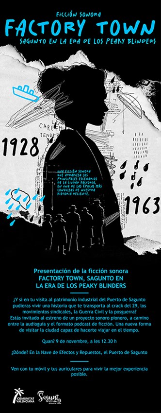 Factory Town, Sagunt en l'era dels Peaky Blinders és un projecte de Sagunt Turisme que s'inspira en fets reals ocorreguts en el Port de Sagunt entre 1928 i 1963. L'acte de presentació d'esta ficció sonora ha tingut lloc en la Nau d'Efectes i Recanvis i han participat l'alcalde de Sagunt, Darío Moreno, i la regidora de Turisme, Natalia Antonino.