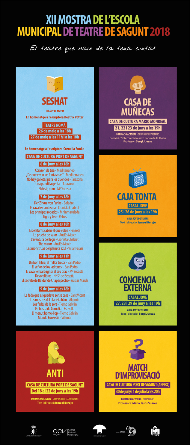 El programa Jugant al teatre de 2018, titulat “Seshat”, està dedicat a les escriptores Beatrix Potter i Cornelia Funke i comptarà amb un total de 25 obres que es representaran en el Teatre Romà i la Casa de Cultura del Port de Sagunt per part de l'alumnat d'infantil i primària dels diferents col·legis de la ciutat i de la comarca, el 26 i 27 de maig en el primer escenari i el 6, 7, 8 i 9 de juny en el segon, en diferents horaris. Com a novetat enguany, la proposta Fireta del llibre és un projecte pel qual s'animarà a la lectura a l'alumnat amb un intercanvi de llibres.